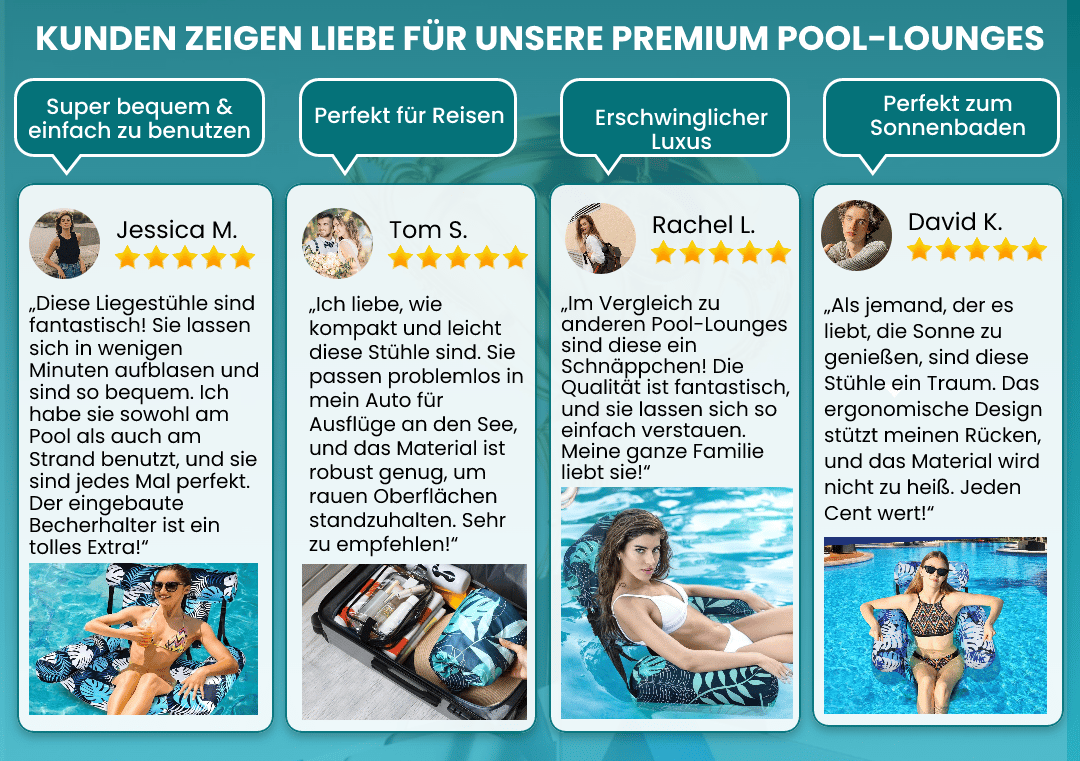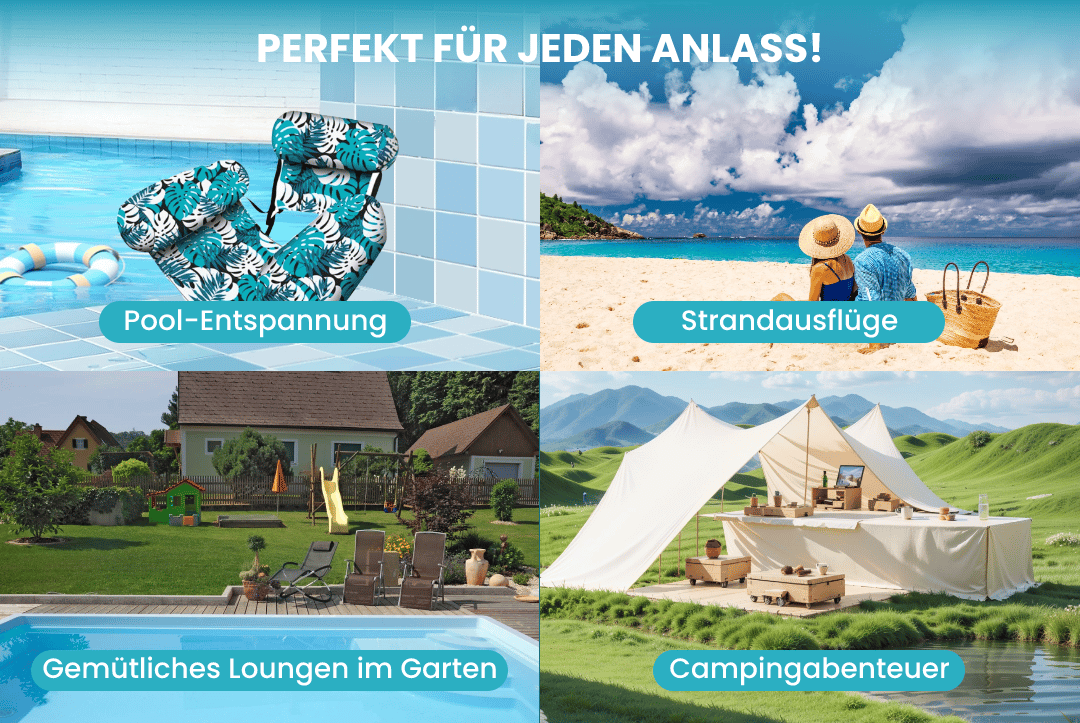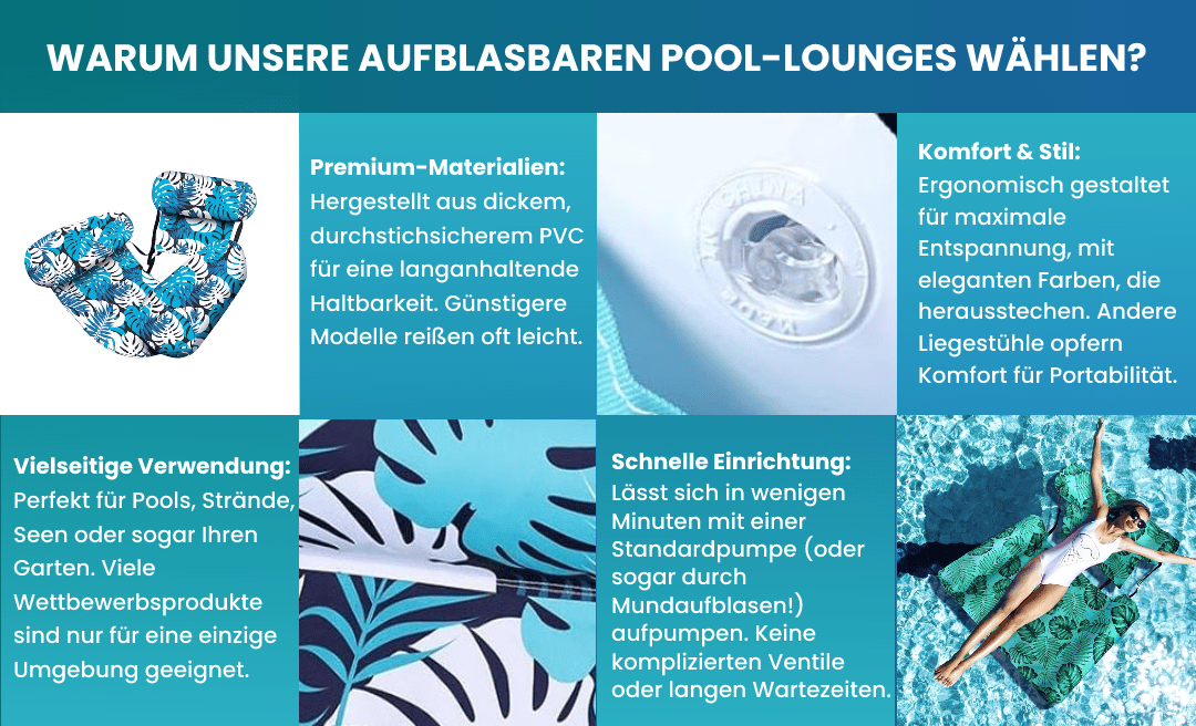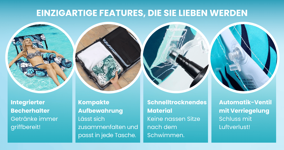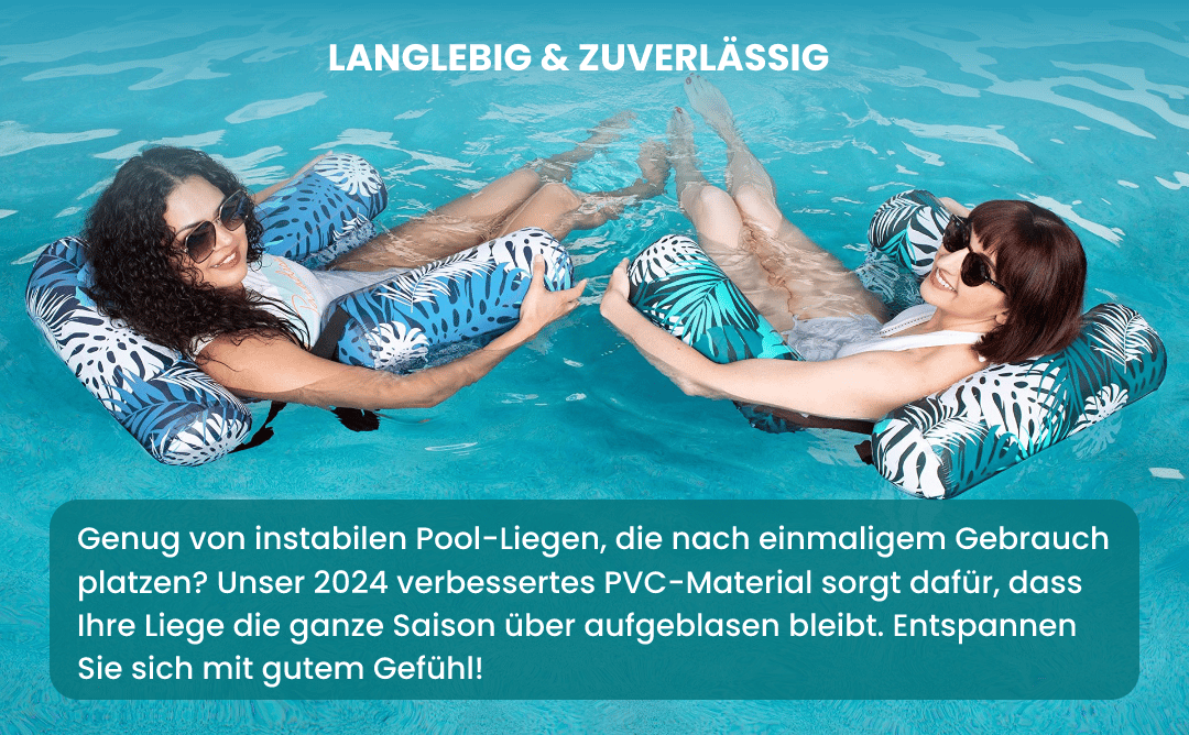 Die Schwimmstühle für den Pool sind ein Muss für den Sommer! Die superbequeme Kopfstütze und der Unterwassersitz halten Sie kühl. Sie sind leicht aufzublasen, stabil im Wasser und lassen sich für den Transport klein zusammenlegen. Perfekt für die ganze Familie.