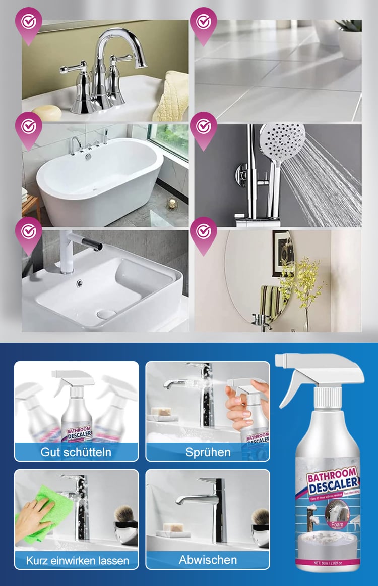 Es handelt sich um einen penetrierenden Schaumreiniger, der Schmutz, Flecken, Fett, Seifenschaum usw. leicht auflösen kann. Erleichtert die Tiefenreinigung und lässt das Badezimmer in neuem Glanz erstrahlen.