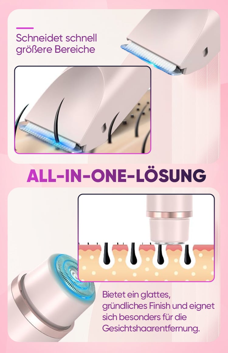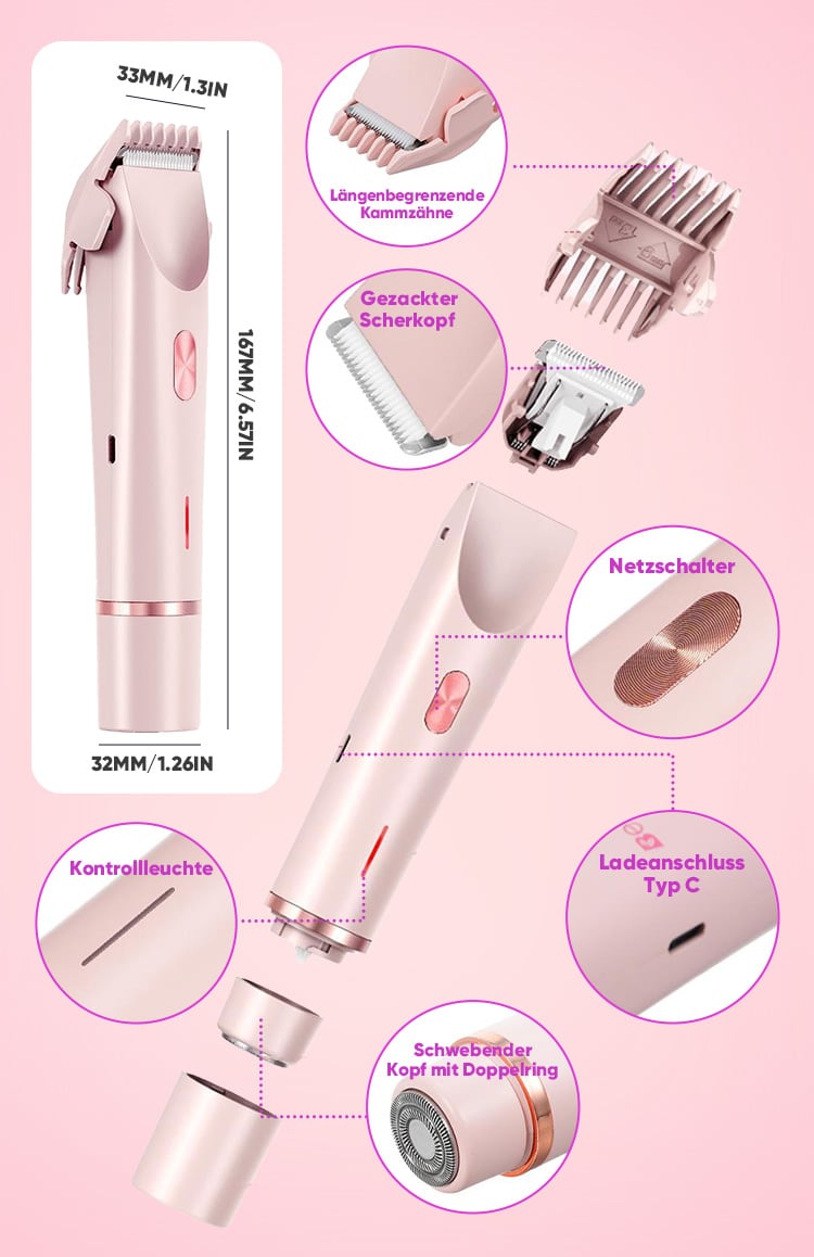Das Doppelkopfdesign eignet sich mühelos für die Pflege von Gesicht, Achseln, Beinen und Bikinizone und ist somit perfekt für verschiedene Bedürfnisse.