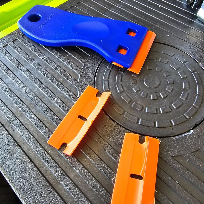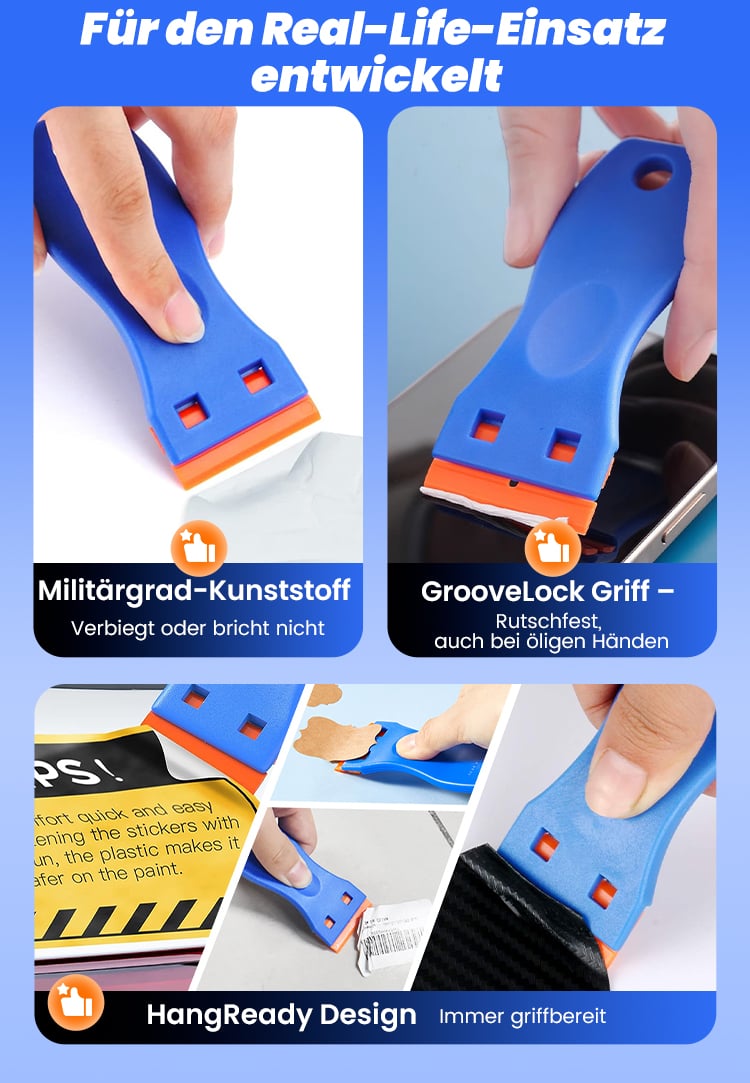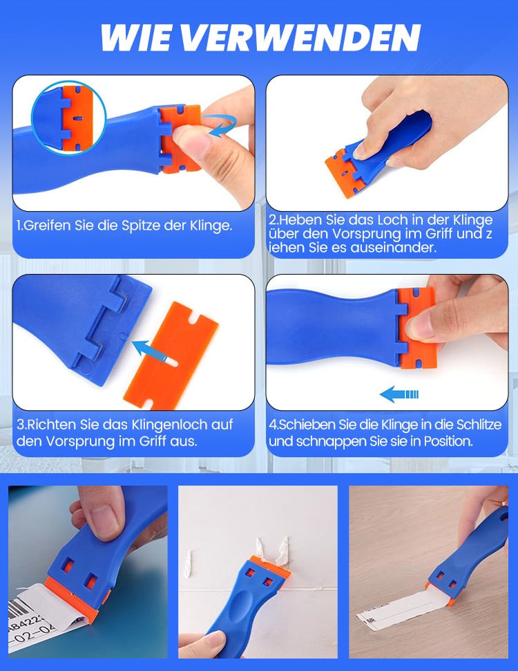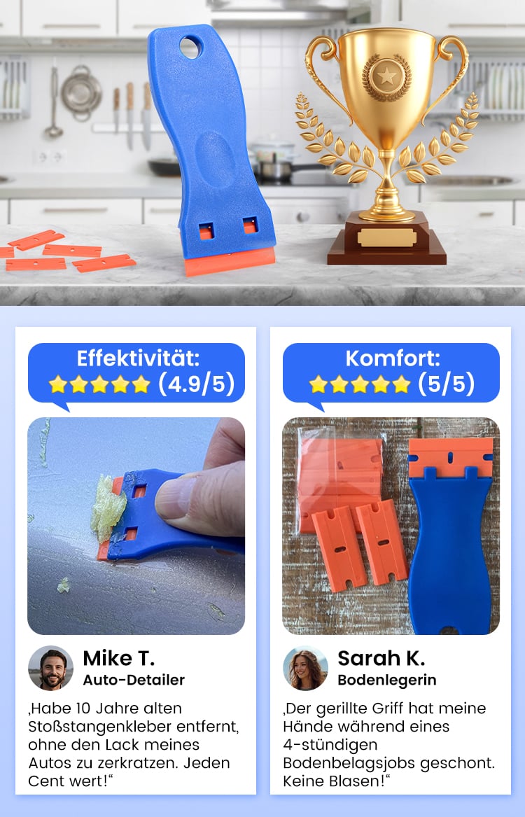 Super! Die Kunststoffklingen entfernen Aufkleber und Kleberreste, ohne meine Arbeitsplatten oder Böden zu zerkratzen. Der Griff ist bequem, und der Klingenwechsel dauert nur Sekunden.
