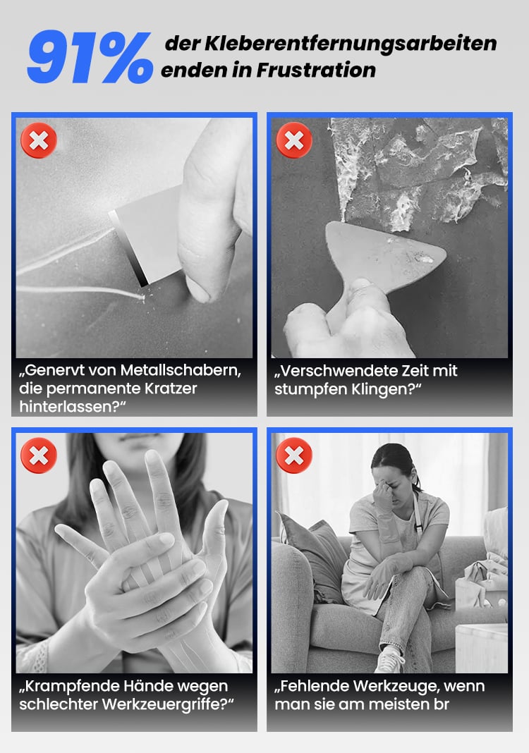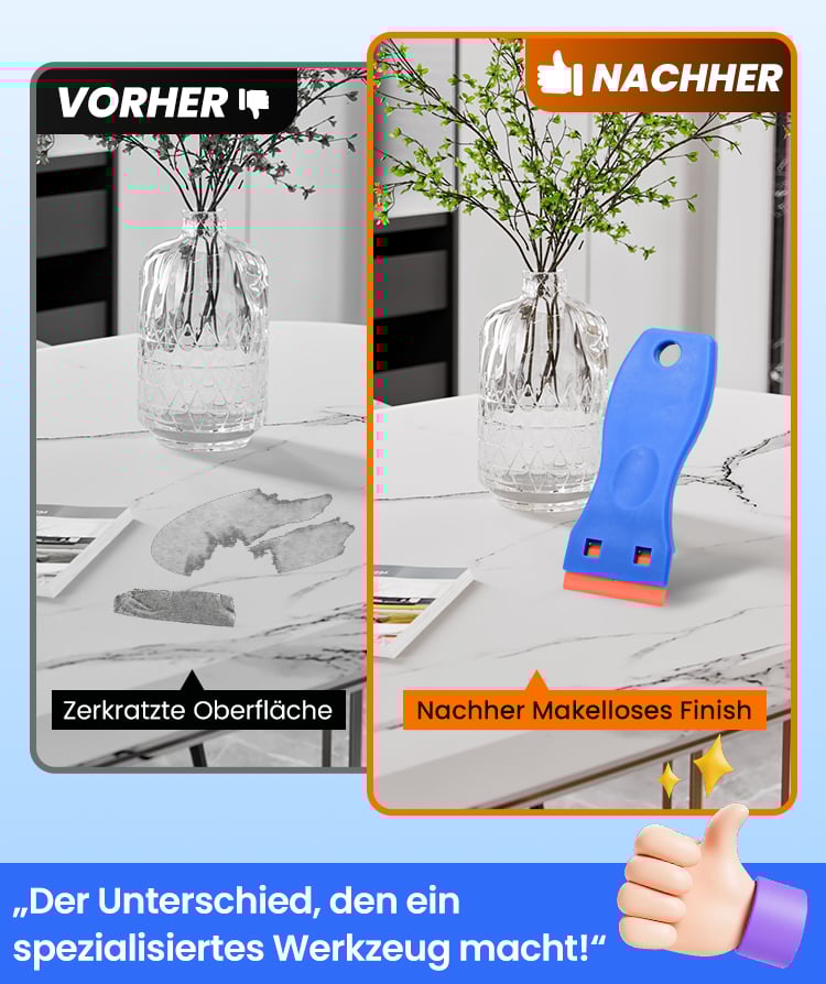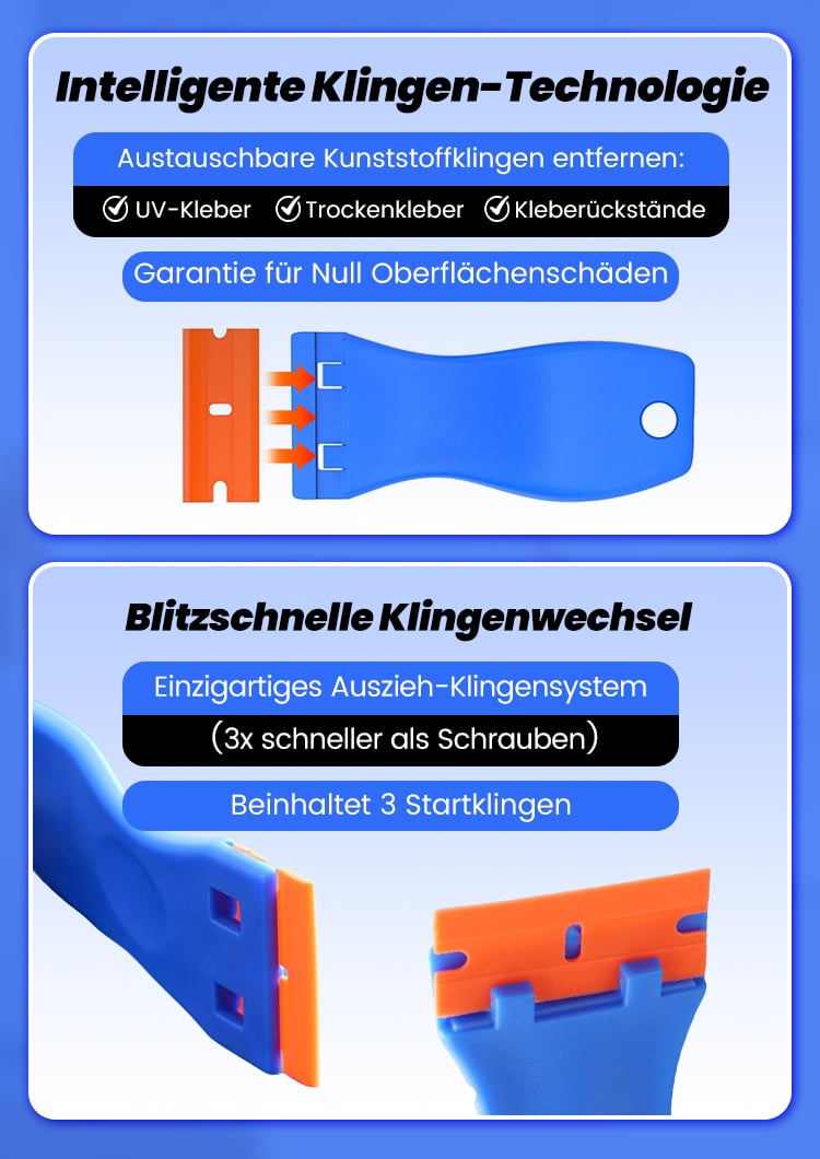 Ja! Die austauschbaren Kunststoffklingen sind so konzipiert, dass sie Klebstoffe entfernen, ohne Oberflächen zu zerkratzen oder zu beschädigen. Sie sind ideal für Holz, Fliesen, Glas und andere empfindliche Materialien.