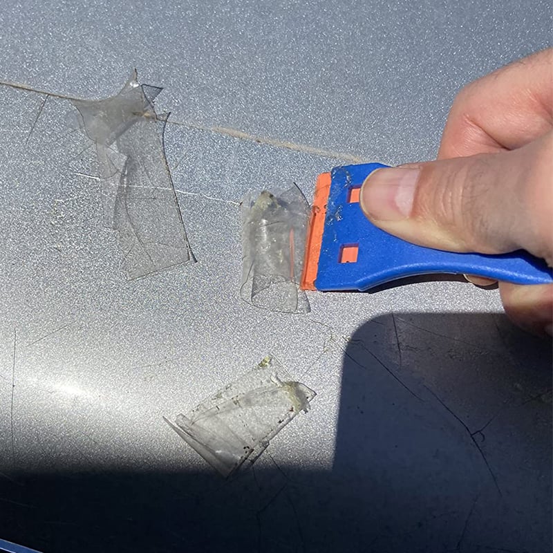 Ja! Er ist dafür entwickelt, UV-Kleber, getrockneten Kleber, Aufkleber und mehr zu entfernen, während die Oberflächen unbeschädigt bleiben. Die strapazierfähigen Kunststoffklingen sind robust, aber schonend.