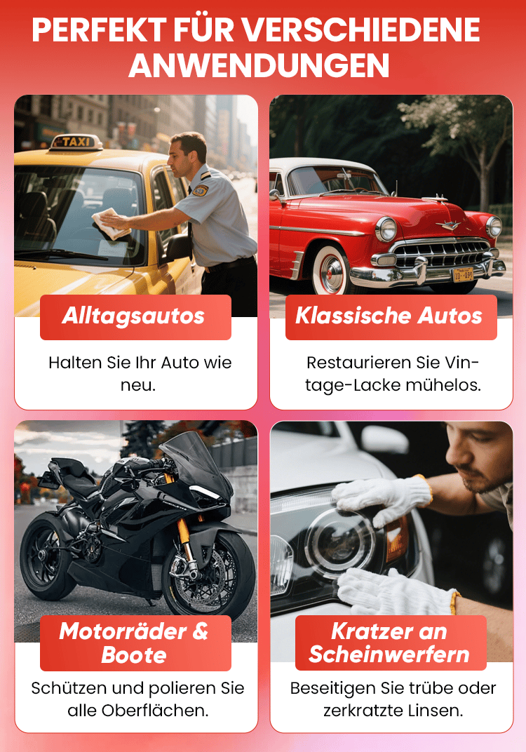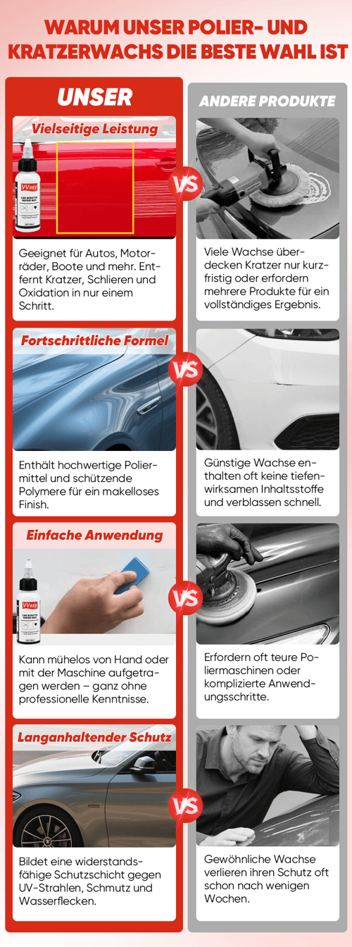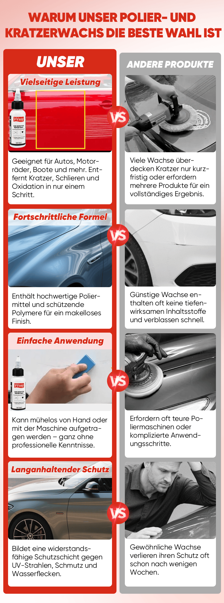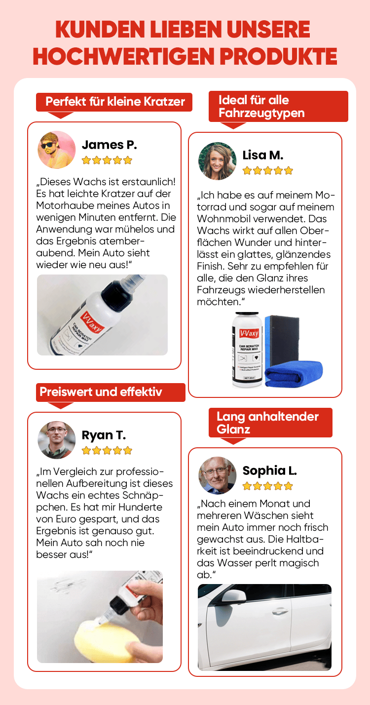 Ich war anfangs skeptisch, aber dieses Polierwachs gegen Kratzer hat wahre Wunder bei den leichten Kratzern und Schleifspuren auf meinem Auto bewirkt. Schon nach einer Anwendung waren die Kratzer deutlich weniger sichtbar, und der Lack sah viel glatter aus. Einfach aufzutragen und abzupolieren – auf jeden Fall zu empfehlen für schnelle Ausbesserungen!