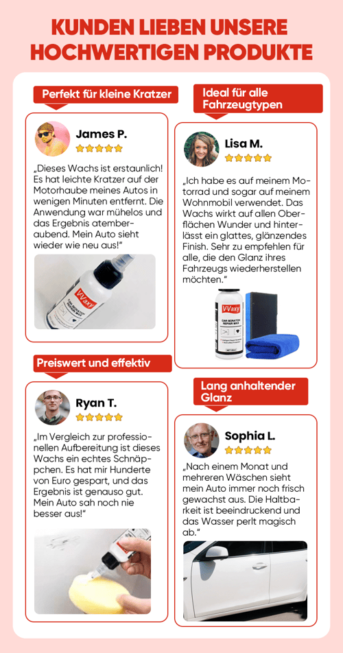 Nachdem ein Einkaufswagen einen unschönen Kratzer an meiner Autotür hinterlassen hatte, habe ich dieses Wachs ausprobiert – und der Kratzer ist fast vollständig verschwunden! Ich bin beeindruckt, wie gut es den Kratzer in den umliegenden Lack eingeblendet hat. Dieses Produkt kommt auf jeden Fall in mein Autopflege-Set!