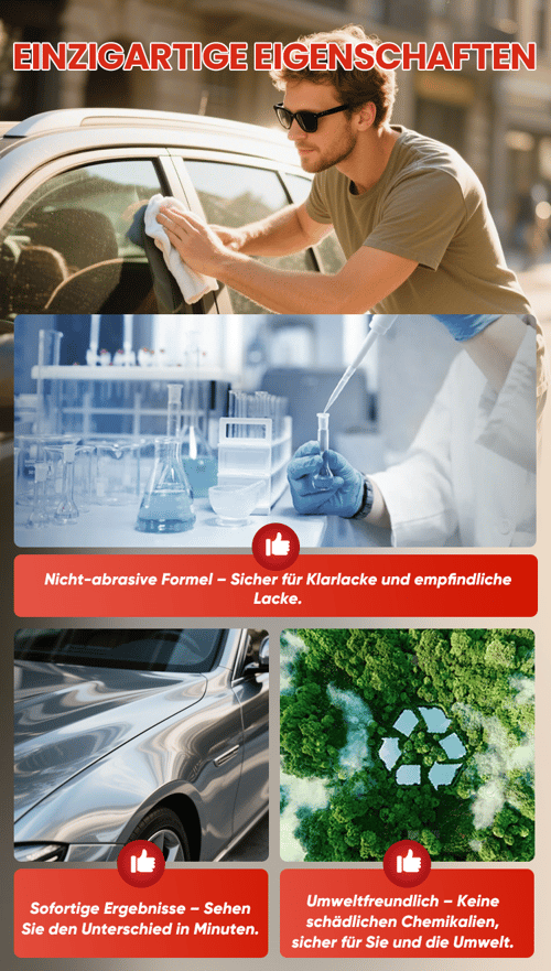 Es ist in erster Linie für lackierte Oberflächen konzipiert. Verwenden Sie für Kunststoffverkleidungen oder Scheinwerfer eine spezielle Kunststoffpolitur oder ein Restaurationsprodukt, um Rückstände zu vermeiden.