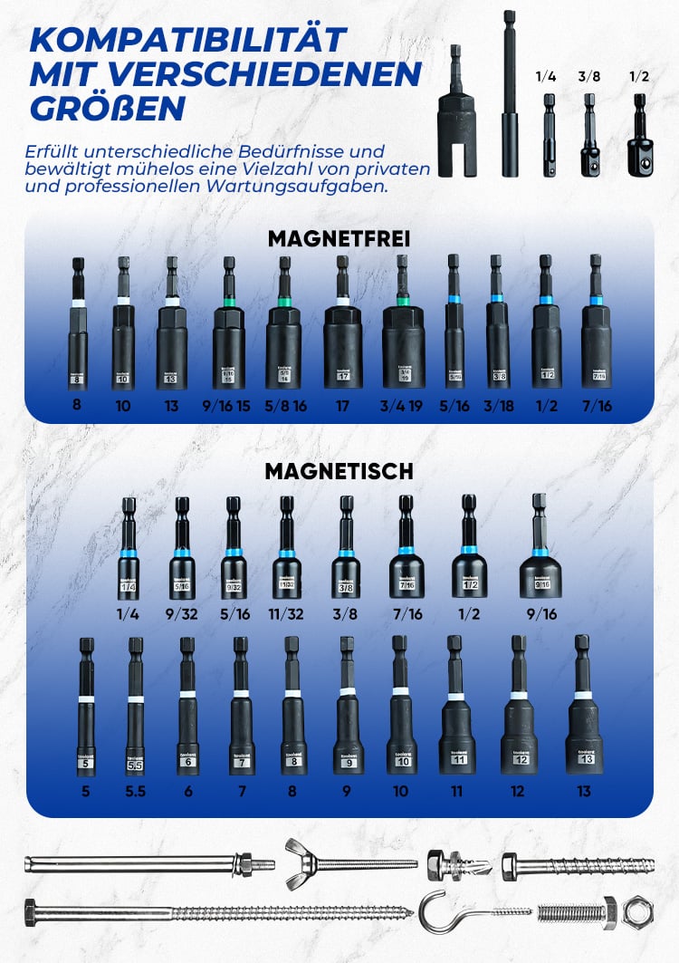 4. Aufnahmen für Steckschlüssel (1/4", 3/8", 1/2" / ca. 6,35 mm, 9,53 mm, 12,7 mm)