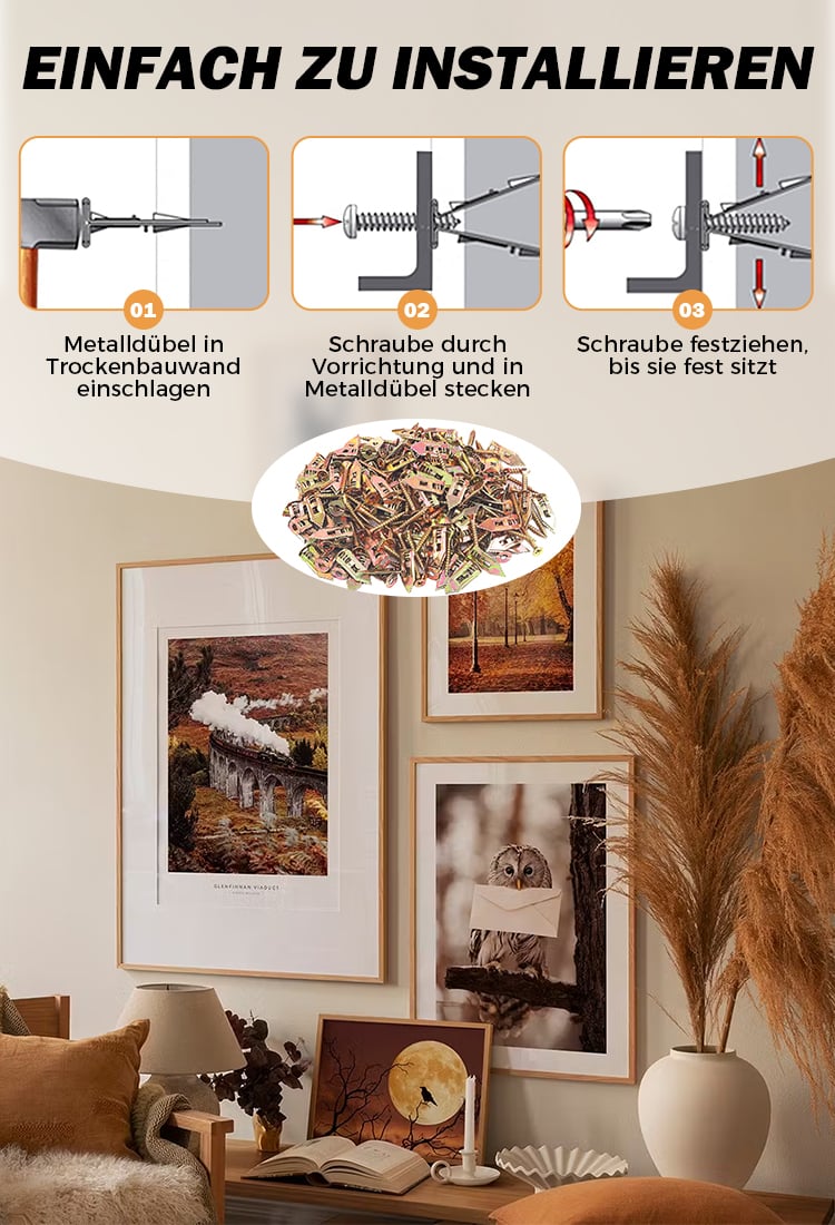 Sie können es einfach mit einem Schraubendreher in die Wand einsetzen. Schraube und Gegenstand lassen sich leicht entfernen, sodass der Anker zur Wiederverwendung in der Wand verbleibt und nach der Verwendung kein Loch in der Wand zurückbleibt.