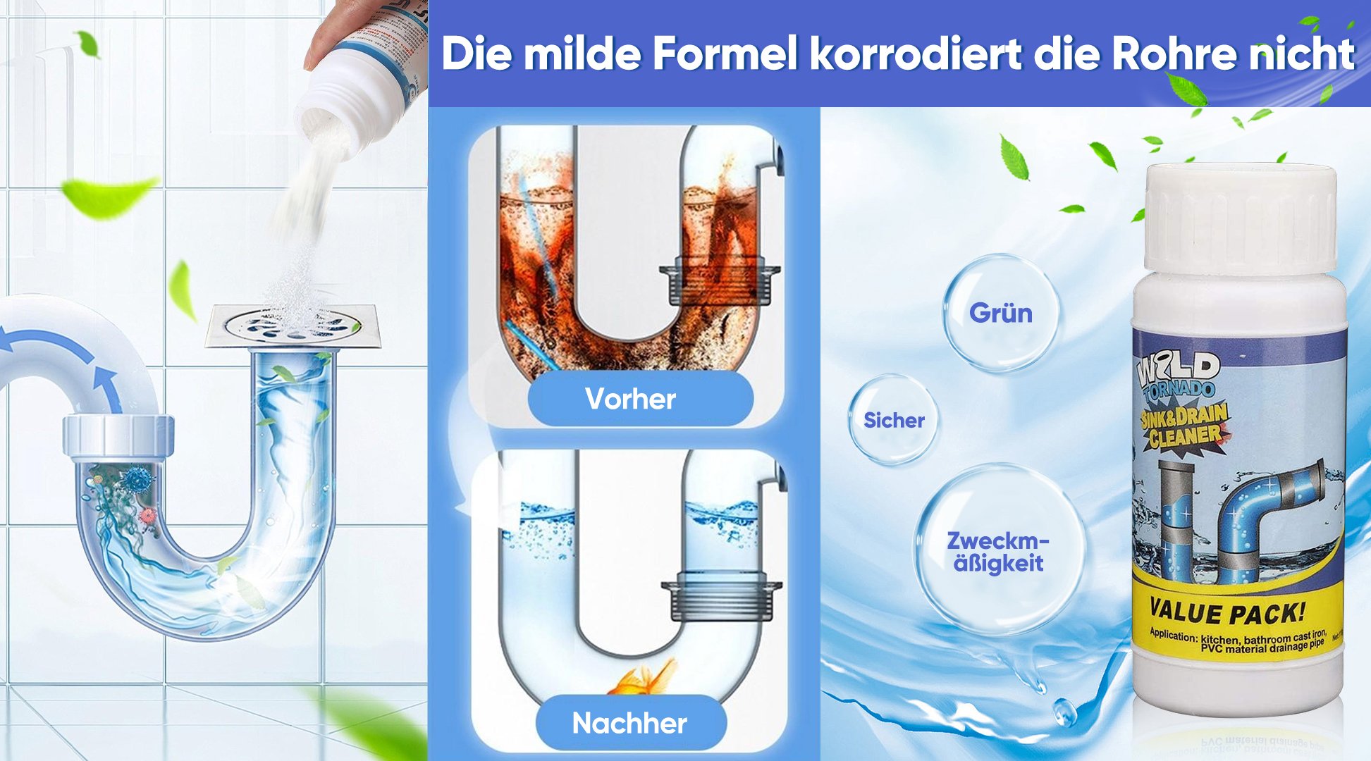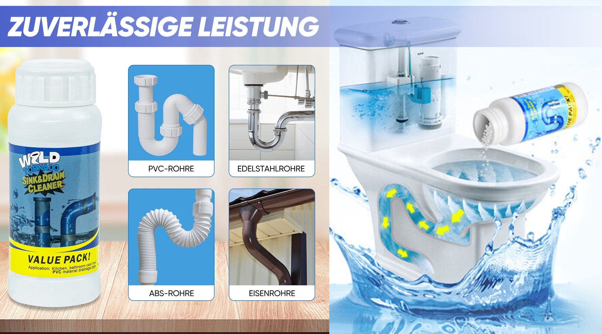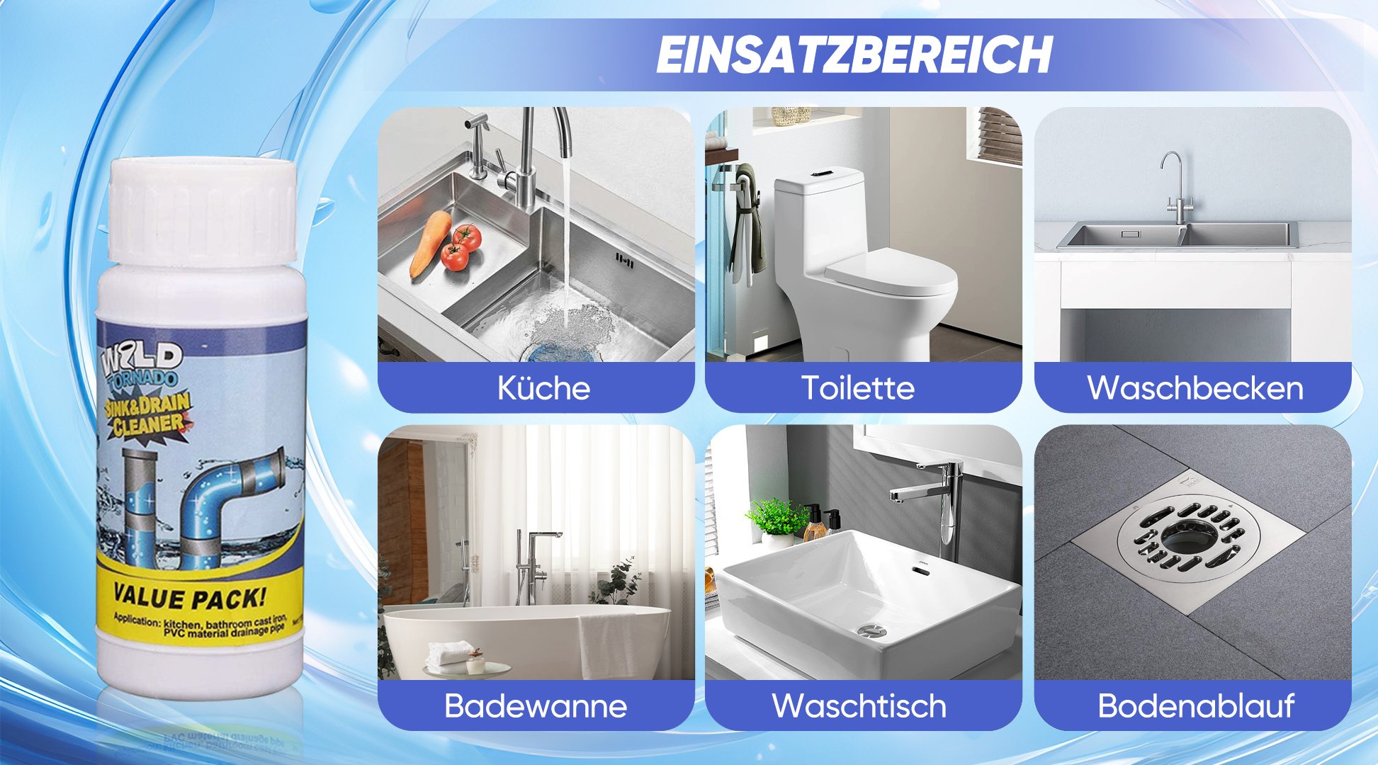 Löst mühelos Fett, Haare, Öle, Seifenschaum und Papierprodukte.
